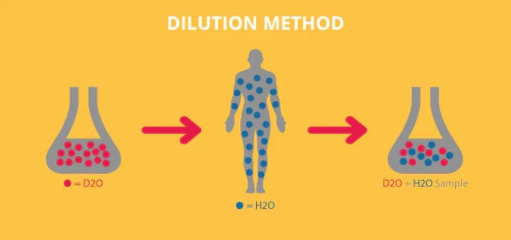 Дилюційний метод полягає у вживанні точно відомої кількості так званої «важкої води» (оксиду дейтерію), після чого рідині дають час рівномірно розподілитися в організмі. Далі визначають співвідношення важкої води до звичайної води в біологічних рідинах, що дозволяє розрахувати загальний об’єм води в організмі (TBW).